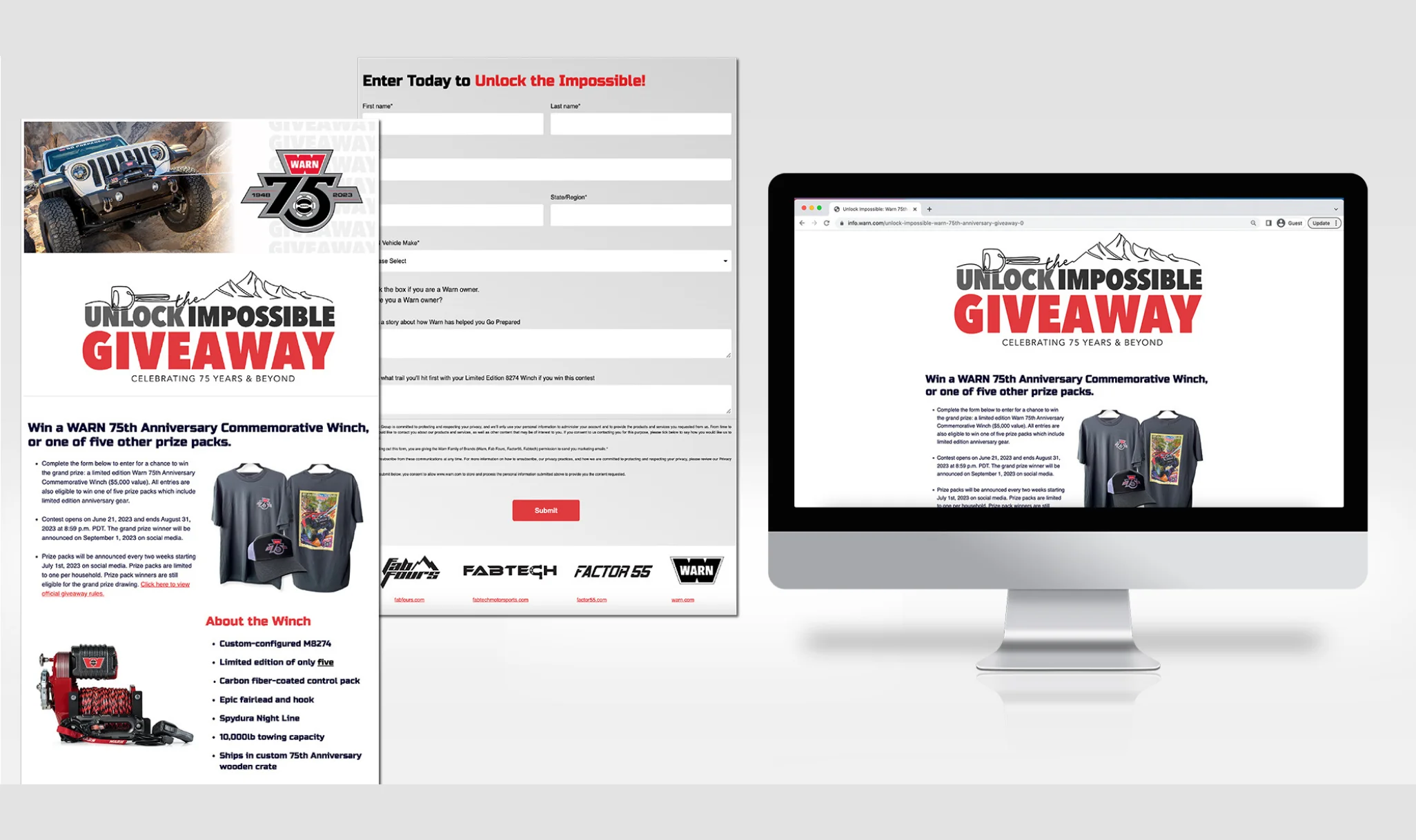 Once the campaign message was set, our design team worked to create a logo identity that told the story of Warn’s history of unlocking the impossible. To mirror a path, our design team created a logo symbol that connected a truck key to a mountain peak with a monoline design, signifying the winding path that Warn has blazed over 75 years. The text and other iconography were designed in line with the overall corporate brand identity. With messaging and graphics in hand, our digital team created a landing page, giveaway collection form and configured backend automation so Warn could collect giveaway entries and communicate with them effectively and quickly, all while adding them to the database of potential customers.